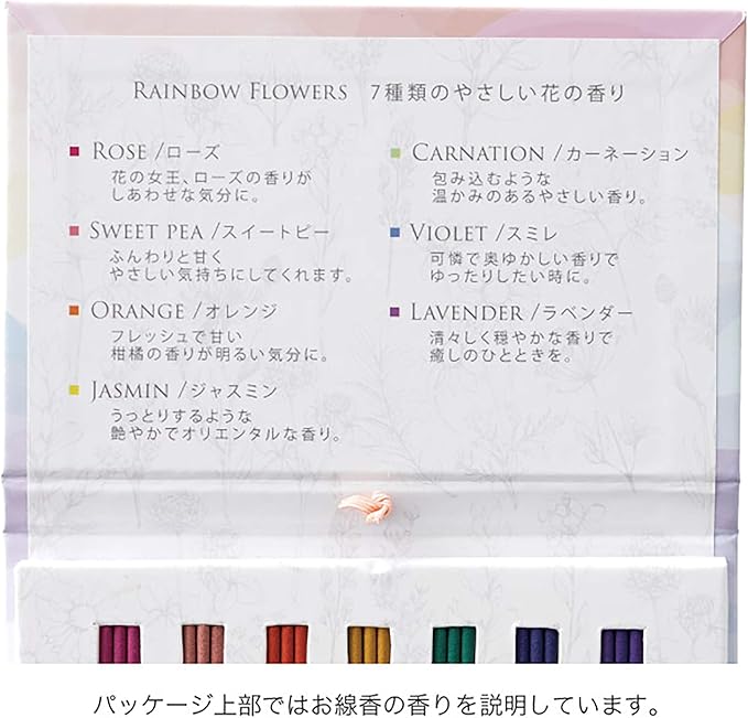 7種の香りのお香(線香)が入ったインセンスセットです。淡い色合いのレインボーデザインのパッケージがポイントです。愛するペットへお供えの贈りものとしても。