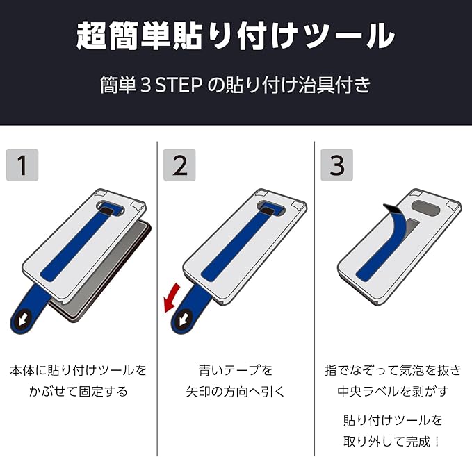 ■端末に被せて、テープを引くだけでフィルムを正確な位置に貼れる超簡単貼り付けツール付きです。
