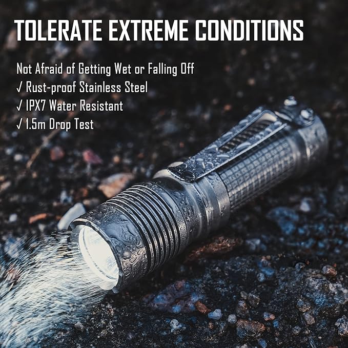 【タフ&信頼性】この多機能懐中電灯は、IPX7防水および1.5メートルの耐衝撃性がテストされた防錆ステンレス鋼でできており、雨や緊急事態での使用に適しています