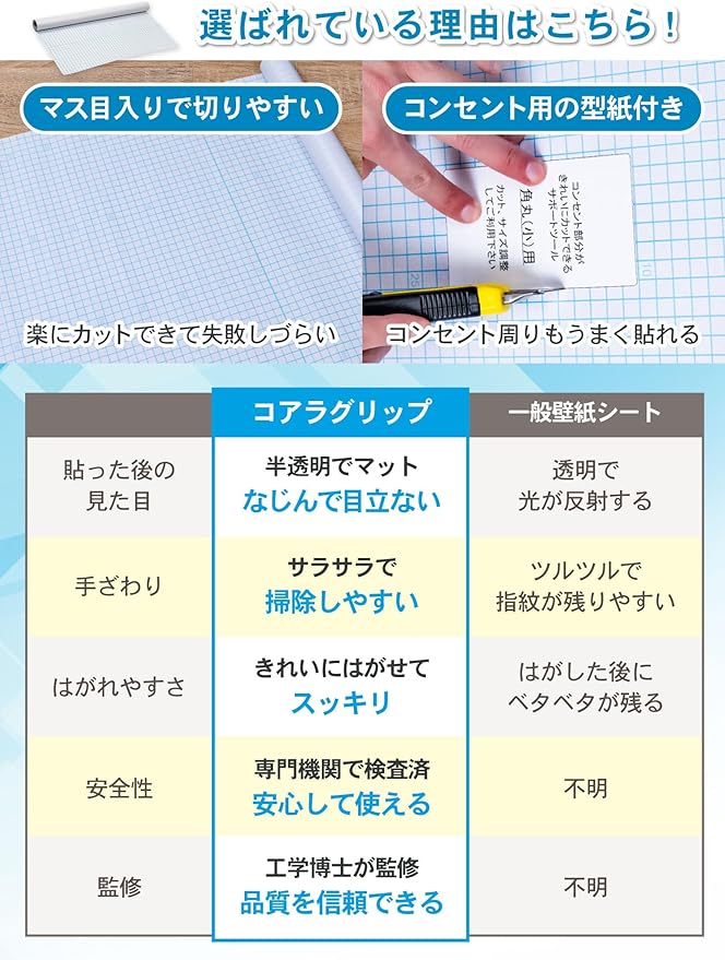 ✅【シリーズ累計出荷57万個の実績】「コアラグリップ」は実店舗販売でシリーズ累計出荷60万個の実績があり、その中で品質を磨き続けてきました。はがせる透明シートだけでなく、「カットしやすいマス目入り」や「コンセント周りをきれいに切り抜いて使えるツール付き」など、設置の際の使い勝手へのこだわりもそのひとつです。