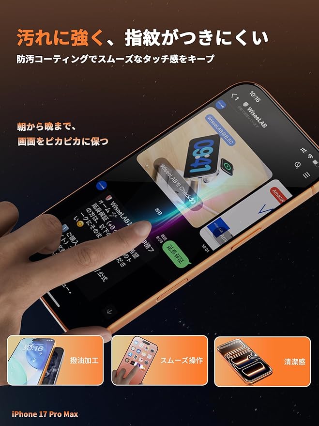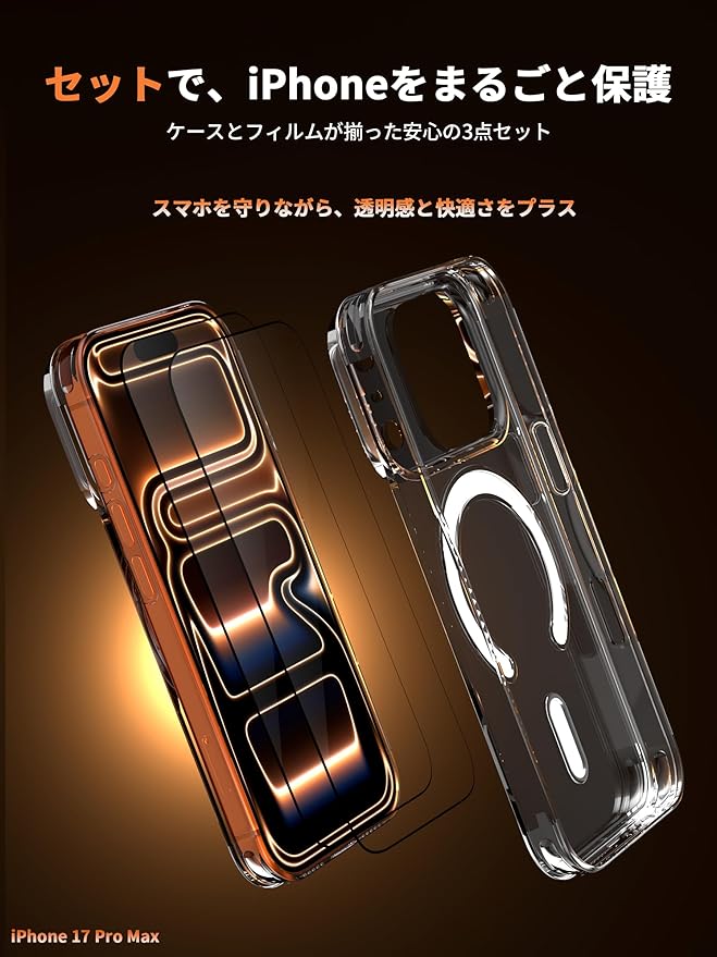 【黄変防止&高透明で美しさ持続】高品質の黄変防止PC素材を採用したiPhone 17 Pro用ケースは、経年劣化による黄変に強く、本体の美しいデザインと色をそのまま長時間楽しめます。高透明度(91%以上)の強化ガラスフィルムは画面の発色を妨げず、指紋防止コーティングでベタつきや汚れを軽減。常に清潔で美しい状態を保ちます。