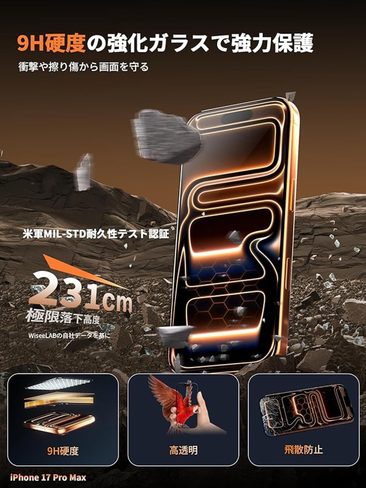 【軍用規格テスト準拠&耐衝撃設計】米軍MIL規格相当の落下テストをクリア。四隅のエアクッションと高耐久PC素材が、日常の落下や衝撃からiPhone 17 Proをしっかり保護。強化ガラスフィルムは4層構造と飛散防止加工で、画面の破損リスクを大幅に低減します。