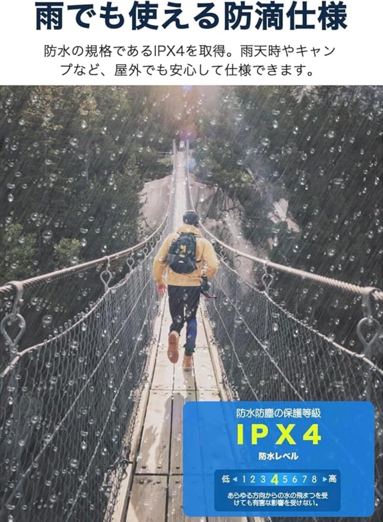【IPX4防水仕様】IPX4の生活防水等級で、じめじめした天気でも屋外の雨でも安心して使用できるワークライト。(ご注意:雨天時や水場では、充電口のシリコンキャップ をしっかり差し込んでおいてください、本製品を水に浸さないでください。)