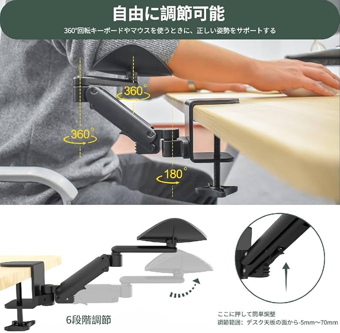 アームレスト 肘置き デスク用 肘掛け アームレスト パソコン 六段高さ調整可能 リストレスト 360 多角度回転 肘 腕 肩 疲労を軽減 耐荷重5kg アームスタンド 肘置き デスク パームレス 黒 ブラック | KAZESHOP