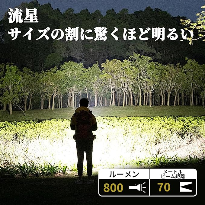 5段階照明モード: エコモード(8ルーメン)から高輝度モード(800ルーメン)まで、状況に応じた明るさ選択が可能。SOSとビーコン機能も搭載
