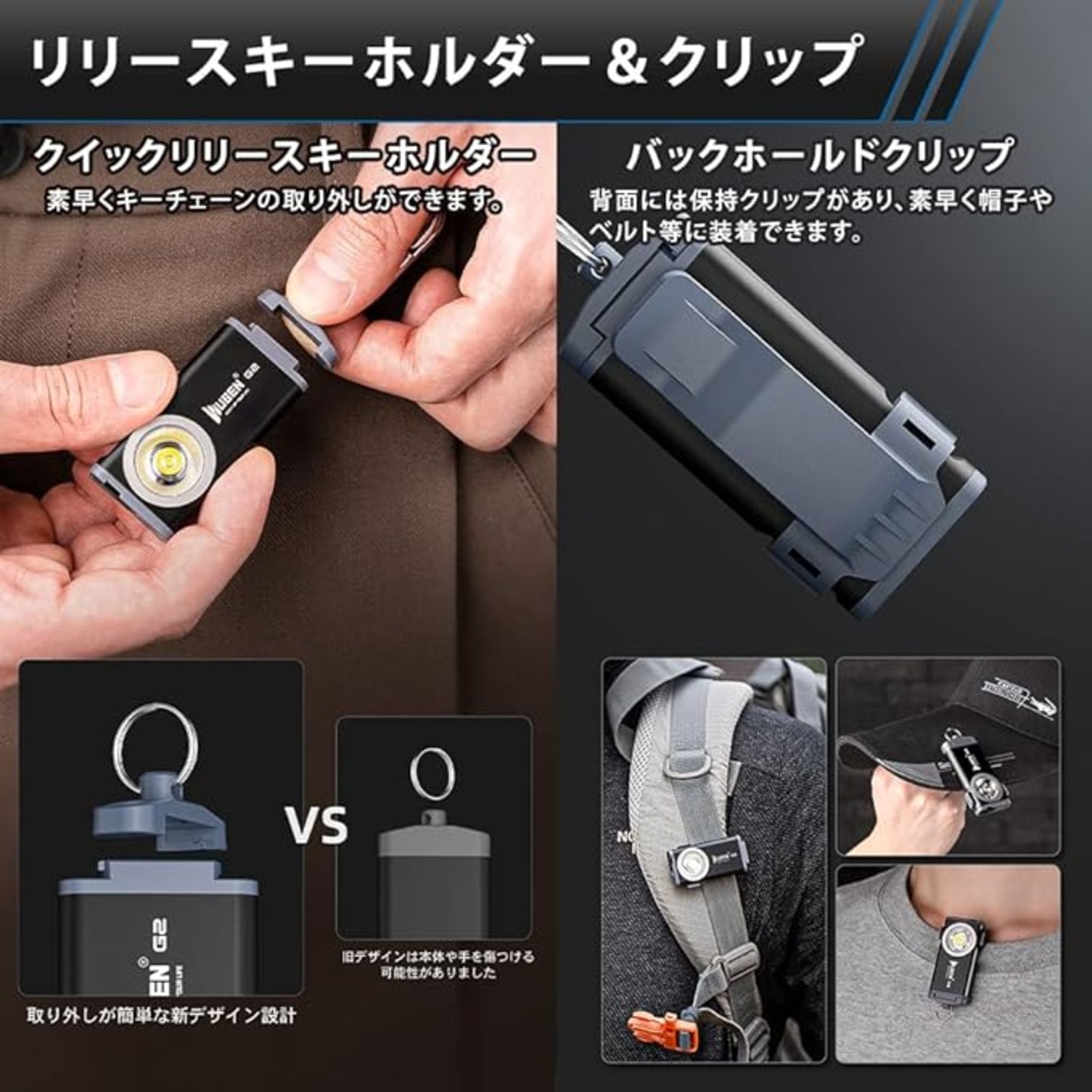 1)点灯・消灯Wボタンスイッチを長押し→点灯。 Wボタンスイッチを押す→消灯。明るさモード記憶機能搭載。ターボモードは記憶されません。2)モード切替点灯時、Wボタンスイッチを長押しするとMoon→Low→Med→Highと切り替わります。指を離すと明るさモードが固定されます。3)クイックターボモード点灯及び消灯時、Wボタンスイッチを連続2回押し→Turboモードで点灯。Wボタンスイッチを押す→消灯。Wボタンスイッチを長押し→モード切替