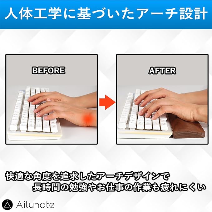 【快適な使用感】表面は滑らかで、手触りが心地よい木製パームレストです。ナチュラルなデザインがおしゃれで、デスク周りのインテリア雑貨としても存在感を発揮します。機能性とデザイン性を兼ね備えたリストレストです。