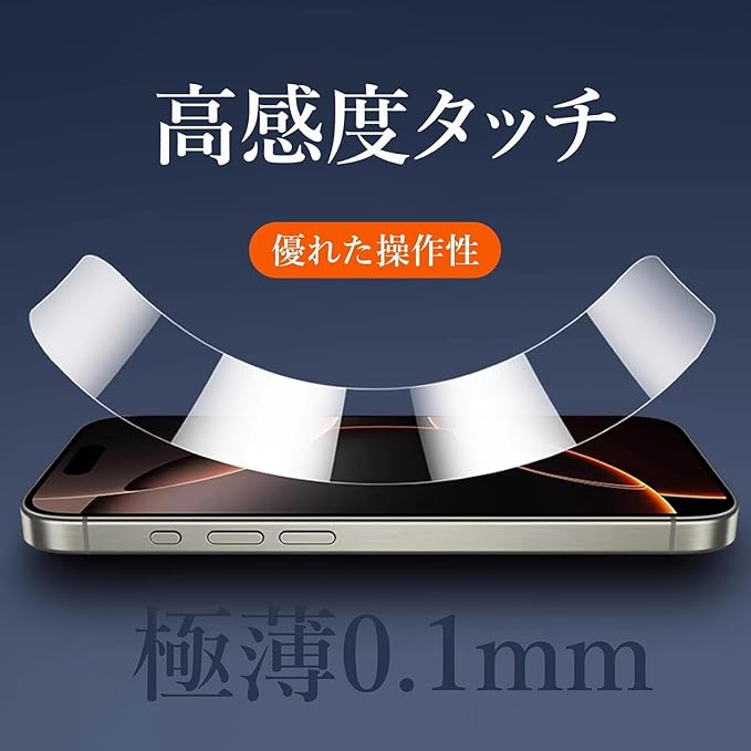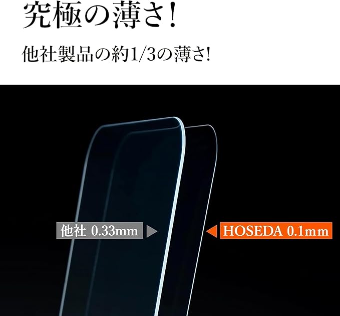 【0.1mm極薄型】業界初の0.1mm極薄型強化ガラスフィルムをご紹介します。通常のガラスフィルムの1/3の薄さを実現し、カメラやセンサーの穴、端の周りも目立たず、小さなゴミやほこりが溜まりにくく、常に清潔な状態を保ちます。極限まで薄さと軽さを追求し、使いやすさにこだわった結果、何も貼っていないかのような一体感を実現。さらに、タッチ感度の向上も可能になりました。