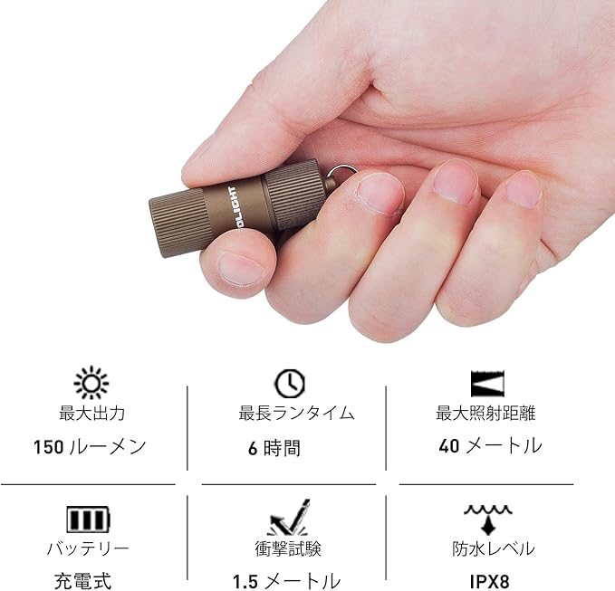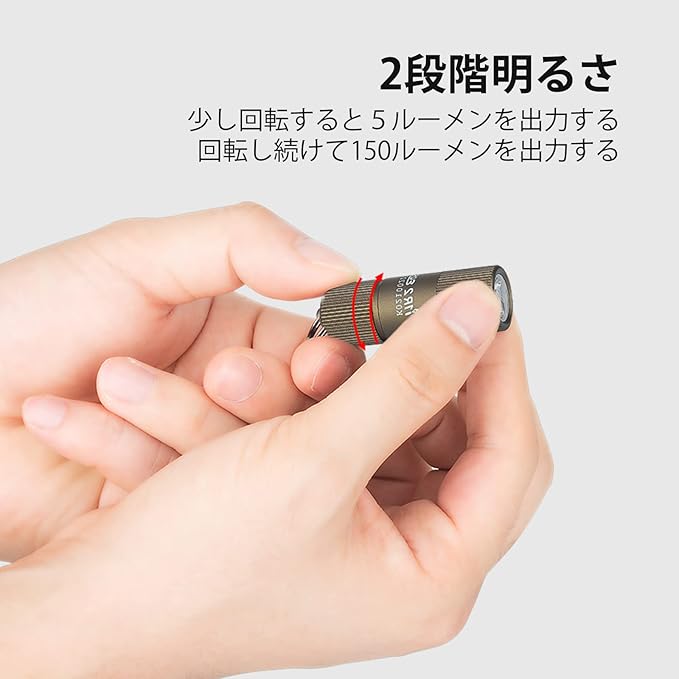 [こんなに小さくても十分な光源] I1R 2 EOS(I1R 2に略称)ミニ懐中電灯はキーホルダーライトI1R EOSをアップグレードした製品です。真新しい五面発光の Chip Scale Packaging LEDを備え、高品質のPMMA TIRレンズを加えて、小型ながらも驚くほどの150ルーメンを出力できます。また、配光も柔らかく目に優しい です