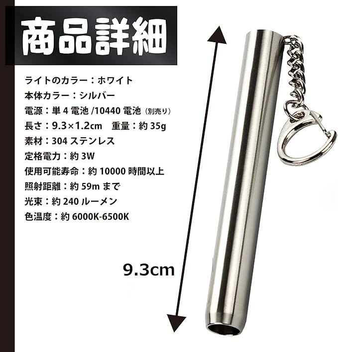 ライトのカラー:ホワイト 本体カラー:シルバー 電源:単4電池/10440電池(別売り) サイズ:約9.3 1.2cm 重量:約35g 素材:304ステンレス 定格電力:約3W 使用可能寿命:約10000時間以上 照射距離:約59mまで 光束:約240ルーメン 色温度:約6000K-6500K ※モニターの環境等により、色の見え方に若干差が生じる場合がございます。