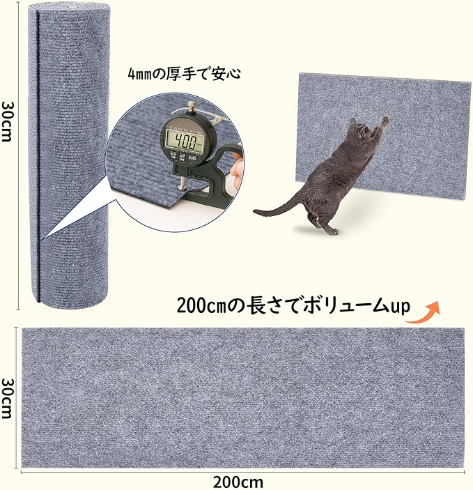 頑丈で安全な素材:この爪研ぎシートは安全で耐摩耗性の良いポリエステル素材で作られ、約4mmの厚手で猫に引っ掻かれたり、噛まれたりしても安心です。200cmの長さでボリュームup、DIYの時シートが足りないとの心配は要らないです。