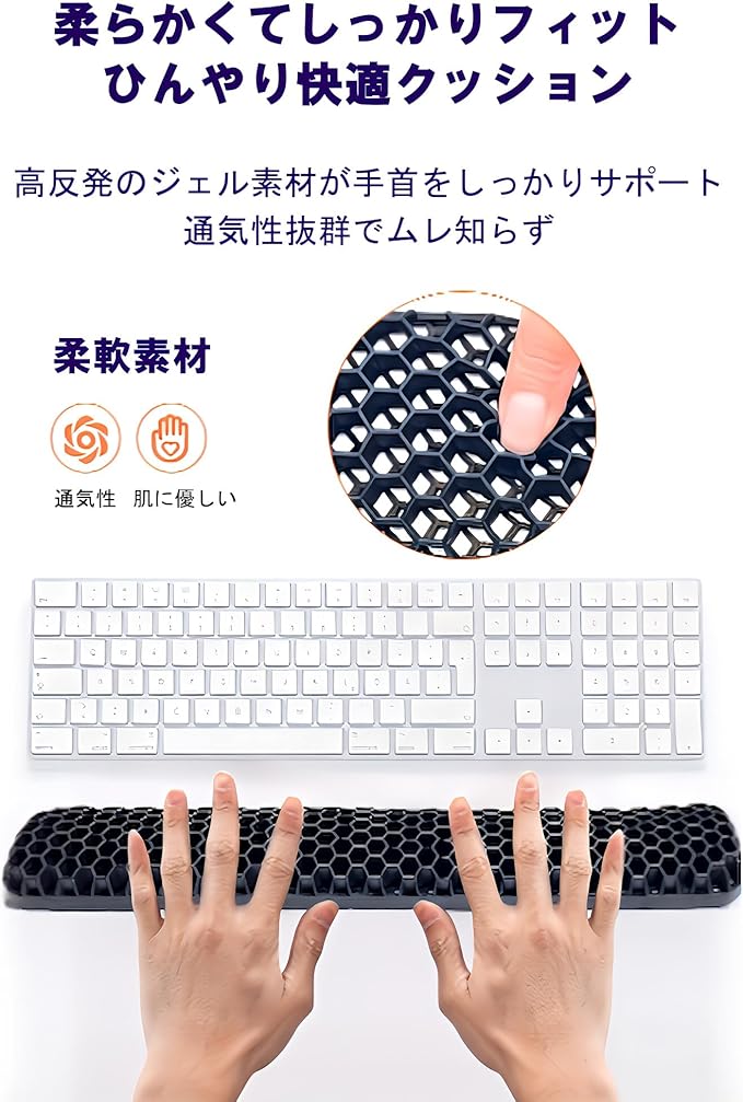 【素材】柔らかくて弾力のある高反発ジェル素材を使用。ゴムのようなしなやかさと耐久性があり、長時間使用してもへたりにくく、肌にもやさしい設計です。通気性に優れたハニカム構造で、ムレにくく快適です。
