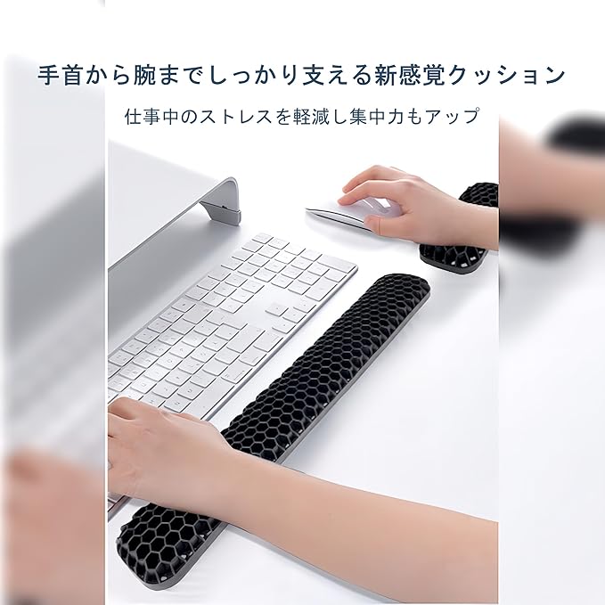【特徴】長時間のデスクワークによる手首・腕・肘の負担を軽減するために開発された次世代型のクッションサポートです。立体的なハニカム構造と優れた通気性により、これまでの平面クッションとは一線を画す快適な使用感を実現。柔らかさとしっかりした支え感を両立し、作業中の疲労を最小限に抑えます。