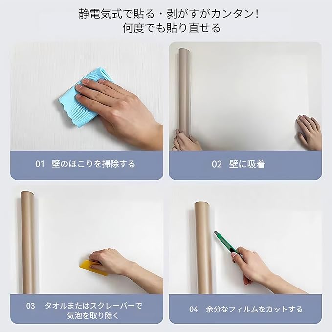 【静電気で貼れる壁紙保護フィルム】静電気式だから、剥がす時も壁紙や塗装面を傷つけません。引っ越しや模様替えの際も壁をきれいなまま保てます。