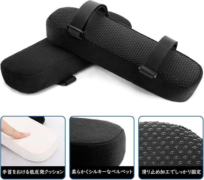 「手首と肘の負担を軽減するアームレストクッション」オフィスチェアや車椅子の肘掛けに取り付けて使用する専用クッションです。低反発ウレタン素材が手首の形にフィットし、キーボード操作やマウス作業時の圧力を分散させ、リモートワークや長時間のゲームプレイ時でも、手首や肘への負担を軽減します。