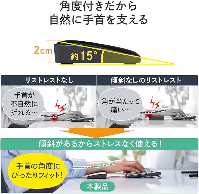 約15 の傾斜がついているので手首の角度に合った傾斜形状でキーボード入力を快適に行えます。高さのあるキーボードでも傾斜をつけることで手首を痛めずに使用できます。