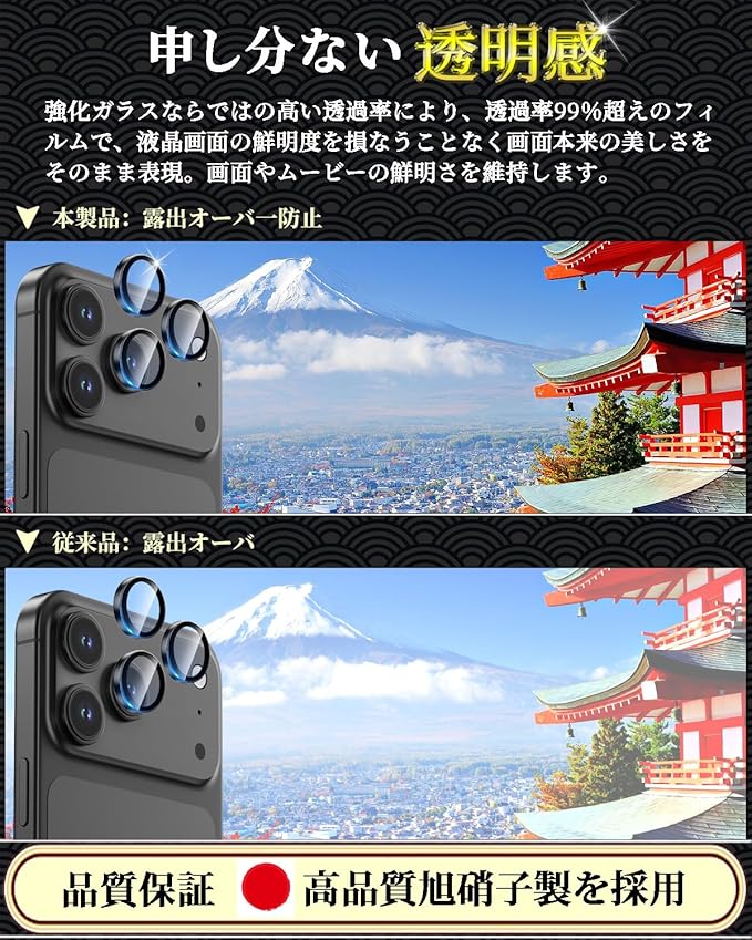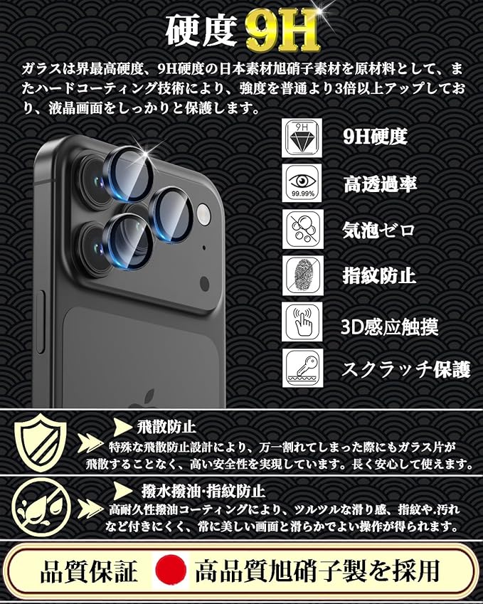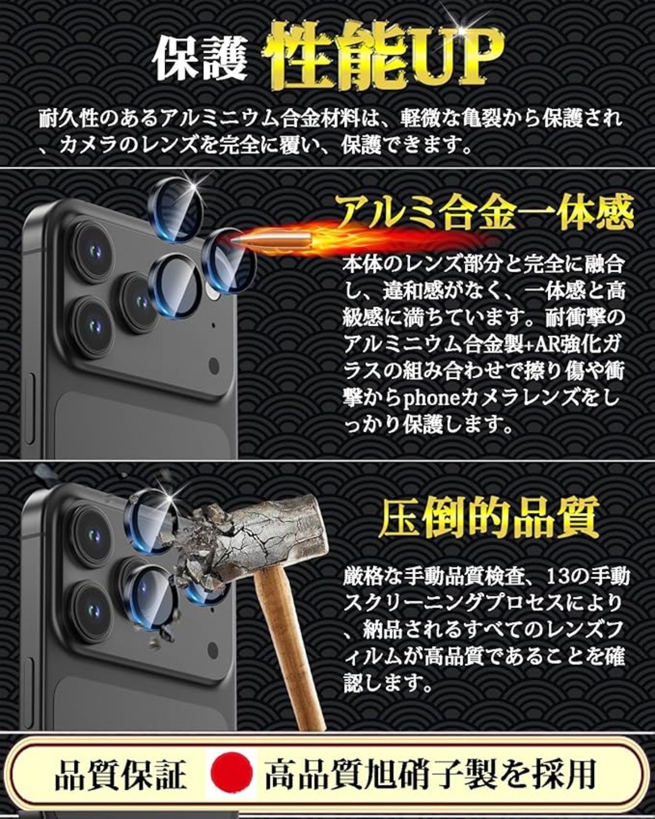 【宇宙航空アルミ合金材料・対応機種】iPhone 17 Pro / 17 Pro Max カメラフィルム。 超高硬度9Hのアルミ合金フレームと強化ガラスを採用。360 の全面防護システムを構築します。日常のキズはもちろん、誤って落とした時の衝撃も吸収・分散し、カメラレンズの割れを根本から防止。高額な修理代からあなたの愛機を守ります。