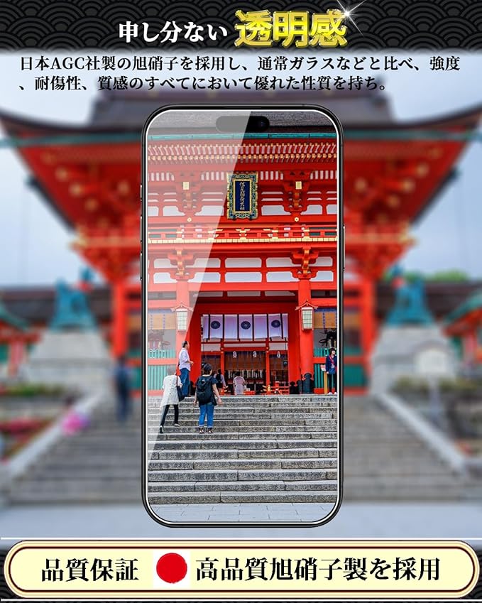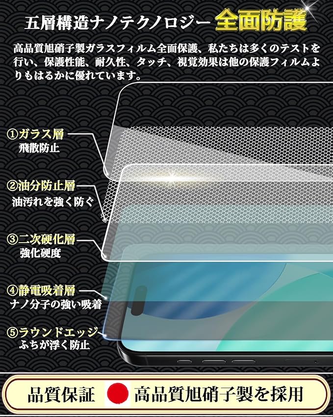 【日本旭硝子素材採用!圧倒的な耐衝撃性】徹底的にこだわった品質、信頼できる日本製旭硝子素材を採用、通常ガラスフィルム などと比べ、強度、耐傷性、質感のすべてにおいて優れた性質を持ちます。安心してご使用いただけるように、一枚一枚、手作業で検品しておりました。また、ガラスフィルム卓越した耐衝撃性能を持って、落下への衝撃からしっかりと保護。万が一強力な衝撃でガラスフィルムが割れてしまっても、破片の飛び散りを防ぐ飛散防止コート処理で、画面をしっかり保護、スマートフォン をよく保護できます。
