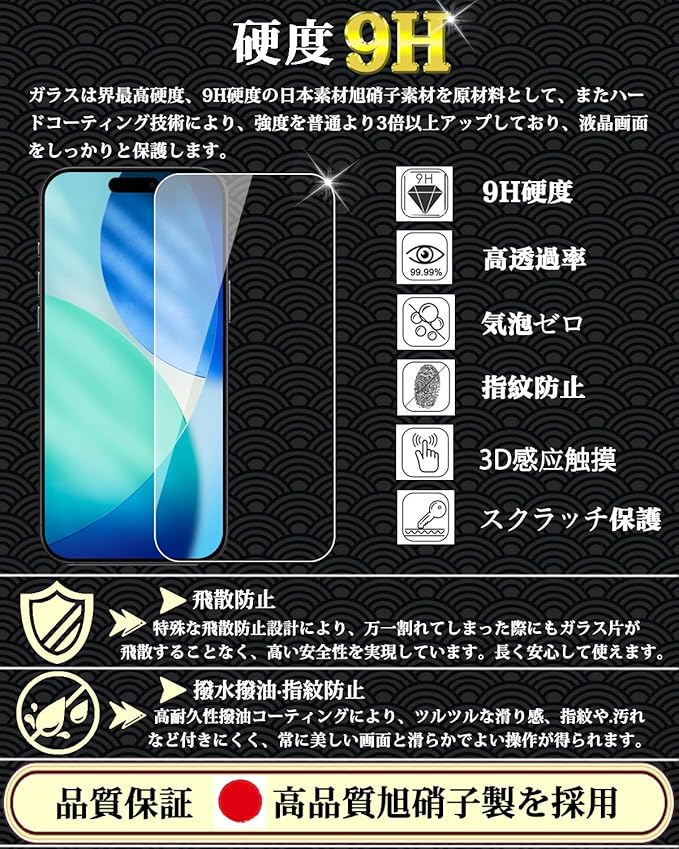 特徴 9H表面硬度,飛散防止,防指紋,撥油コーティング,撥水剤,耐衝撃性,ラウンドエッジ,気泡なし,高透過率,簡単貼り付け