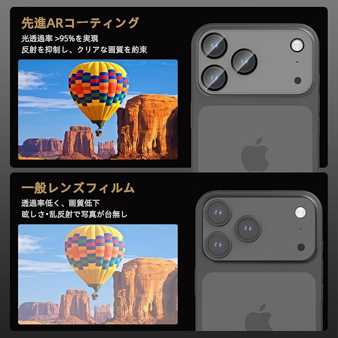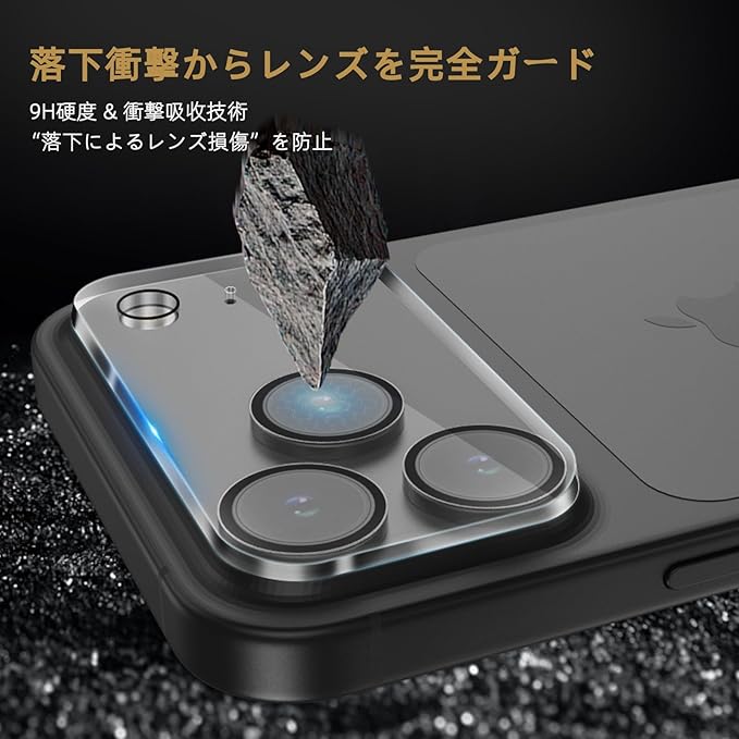 【画質ゼロ影響のオープンレンズ設計 & 全面密着保護】 驚きのオープンレンズ設計を採用。光の透過率は100%を実現し、一切のロスなく元の画質を維持します。さらに、レンズを囲むようにAGC強化ガラスがマイクロフレームを形成し、カメラモジュール全体に隙間なく完全密着。ほこりの侵入を防ぎ、落下や衝突の衝撃からレンズを360 完璧にプロテクトします。iPhone 17 Proの性能を最大限に発揮させるための理想的な保護フィルムです。