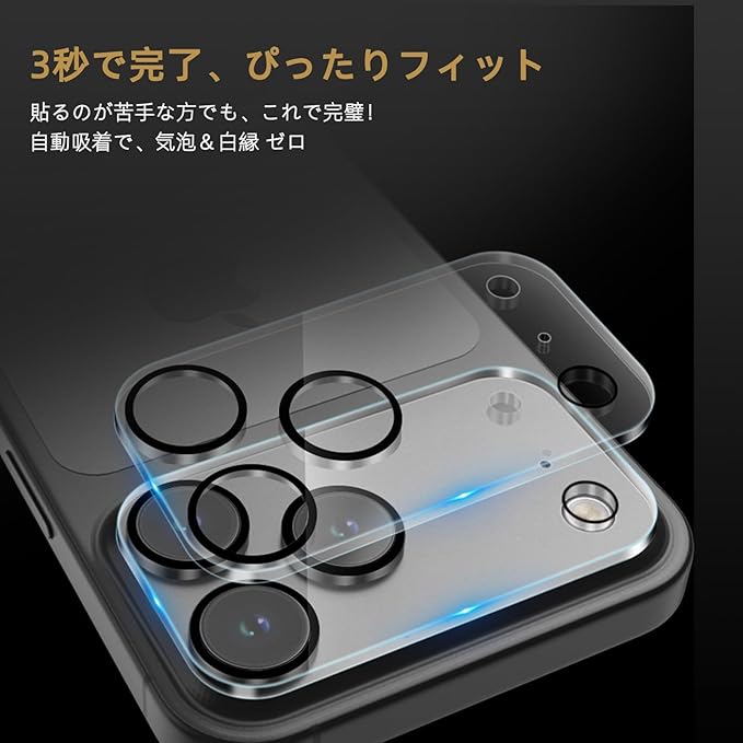 【簡単貼り付けで気泡ゼロ・位置合わせ不要】貼り付けが苦手な方でも安心の静電自動吸着設計。位置を合わせて置くだけで、フィルムが自動的に均一に広がり、面倒な気泡押し出しは不要です。ノンクリア粘着層が、ぴったりと吸着し「白縁」や「浮き」を徹底的に排除。iPhone 17 Pro カメラフィルムの貼り付けが、これ以上なく簡単になります。