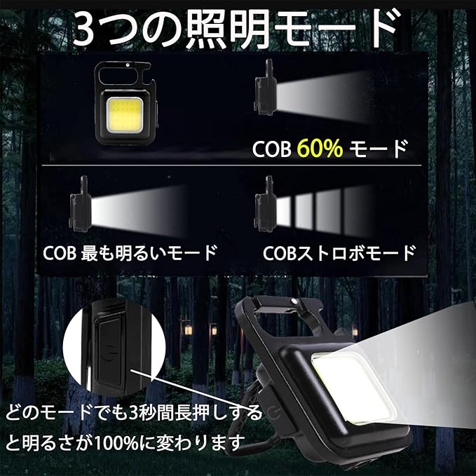 3種のライトモード: COB(チップオンボード)ハイモード、COBローモード、COBストロボモード。