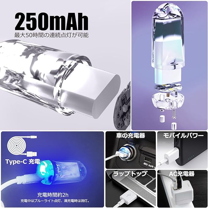 【極小なサイズと超強力な性能】①超小型のサイズで、φ2 4cmの大きさで、わずか11gの重量であり、Apple AirTagと同じ重量です。②高輝度LEDチップを採用し、最大で250ルーメンまで発光します。③充電式 250mAhのリチウムポリマー電池を内蔵し、最大50時間の連続稼働が可能です。④USBインターフェイスを備えており、いつでも簡単に充電できます。⑤スマート調整プログラムを内蔵しており、均一な明るさを保証します。