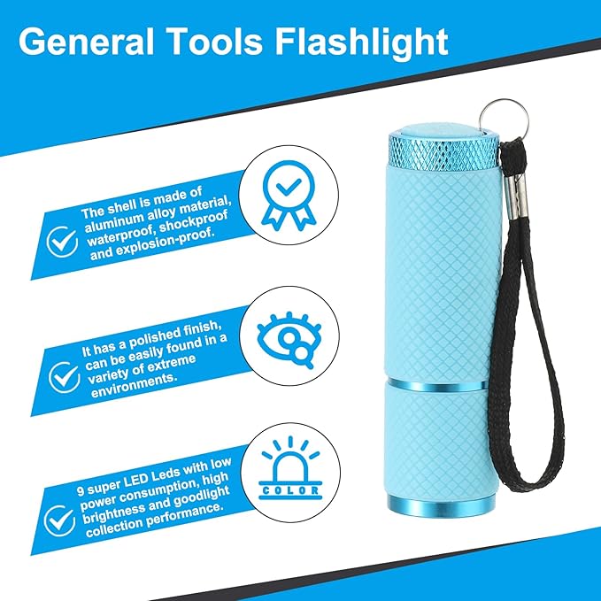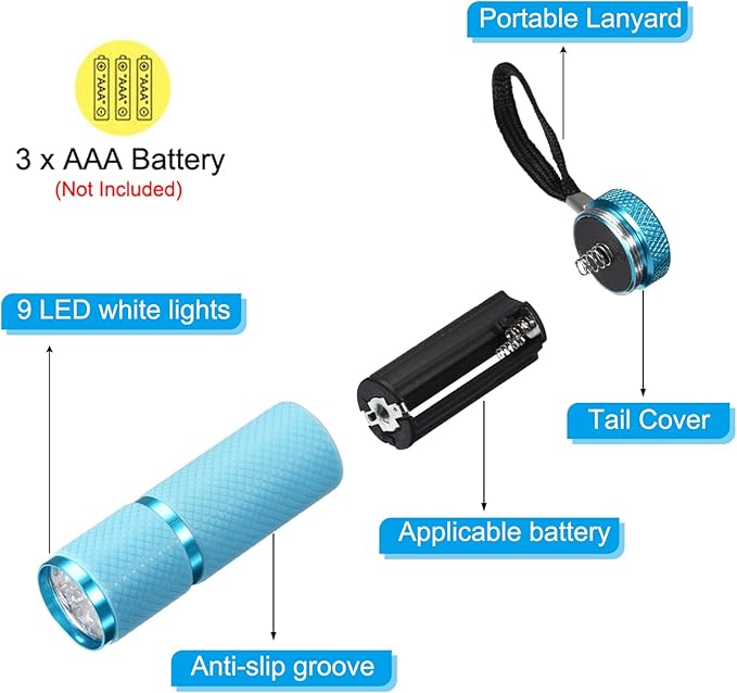 仕様:素材:アルミニウム合金;カラー:ピンク、緑、イエロー、ブルー;サイズ:90 x 26mm / 3.54 x 1.02"(長さ 直径);適用電池:単三電池3本(電池は含まれていません);光源:9個の白色LEDライト;パッケージリスト:LED蓄光フラッシュライト4個(各色1個)