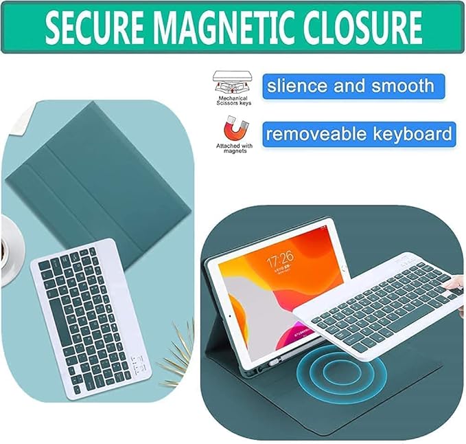 ①脱着可能なBluetoothキーボードケース。マグネットによる着脱式キーボードもカバーも単独使用できます。