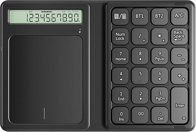 ポータブル設計と優れた耐久性: スリムで折りたたみ可能なフォームファクタにより、このキーボードは持ち運びが簡単で、レザーのような外装が日常の摩耗から保護します。エレガントなマット仕上げは、あらゆるワークスペースを引き立てます。外出先でもワイヤレス数字キーボードの自由をお楽しみください。静かなキーにより、気が散ることのない作業環境が確保され、耐久性があり変形しにくいデザインは、レジや銀行ホールなどの忙しい環境での日常使用にも耐えます。