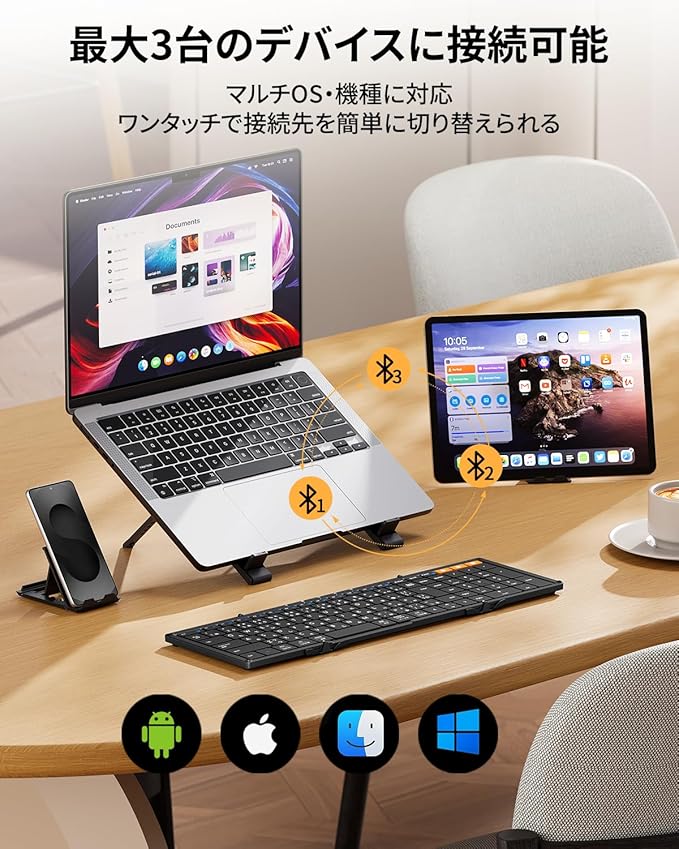 【最大3台同時接続&マルチOS対応】このBluetoothキーボードはiPadOS、iOS、Android、Mac、Windowsなど幅広いOSに対応しており、、最大3台までのデバイスとペアリングが可能です。ボタン一つで接続先を簡単に切り替えられるため、PC、タブレット、スマートフォンなど複数の端末を使い分けている方に非常に便利です。