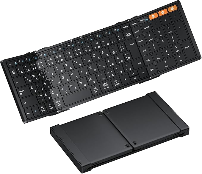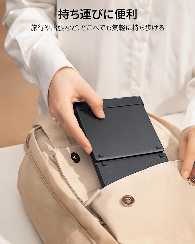 【持ち運びやすい折りたたみキーボード】欧米のSNSで話題沸騰中の2025年最新版XK01折り畳みキーボードが初登場!持ち運びやすさと使いやすさを兼ね備えモデルです。三つ折り構造で折りたたむとiPad miniと同じくらいサイズになり、重さも291gと軽量で、外出や出張などの際の持ち運びに便利です。使用しない時はカバンの隙間やパソコンケースにサッと収納できます。コンパクトで軽量な設計により、自宅だけでなく、カフェや図書館、オフィス、飛行機内など、場所を選ばず快適に作業ができます。(展開時サイズ: 38.58 11.89 1.22cm、折りたたみ時サイズ: 21.49 11.89 1.98cm)