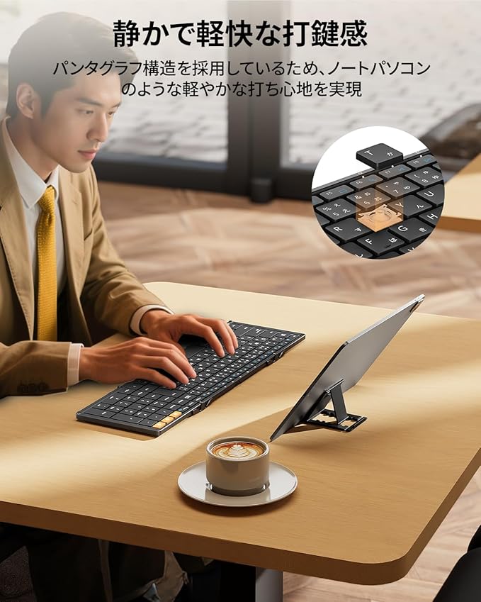 【ノートパソコンのような打ち心地】ノートパソコンと同じパンタグラフ構造とキーサイズを採用しているため、あらゆる場所でノートPCのような軽快な打鍵感を実現しています。打鍵しやすいキーピッチ19mmのアイソレーション設計と浅めの1.2mmのキーストロークで、誤入力を防ぎつつ、快適なタイピングが可能です。