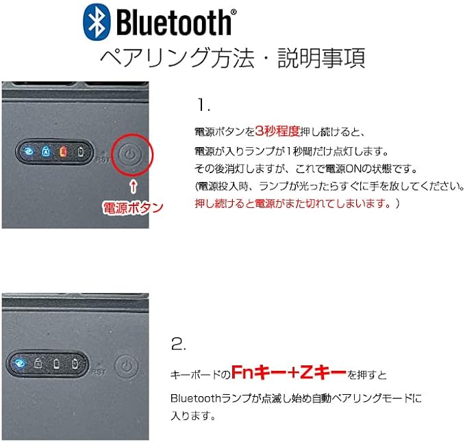 ※無操作状態で15分間キーボードはスリープモードに入ります。再度起動するには、任意のキーを押し、5秒間を待ってください。
