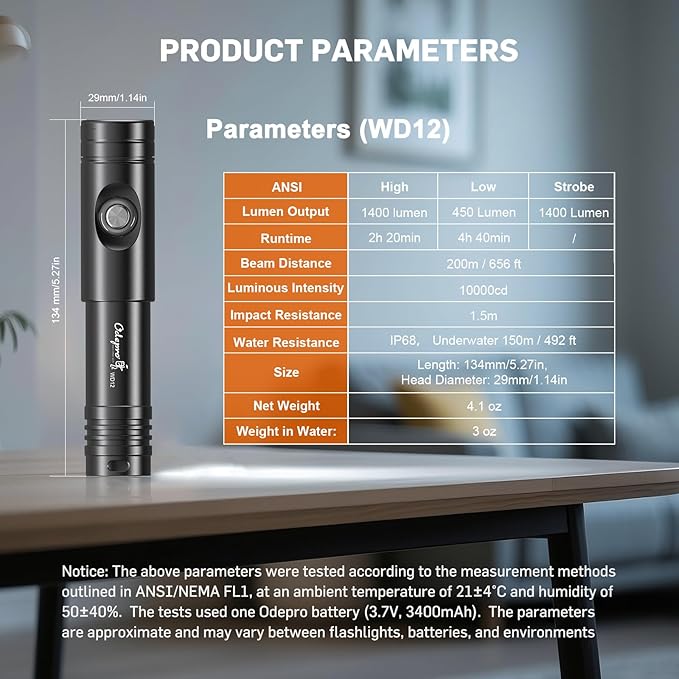 長距離スポットビーム:Odepro WD12ダイブライトは、12度の狭いビーム角を持って,ビーム距離は170メートルに達する可能性があります。 周辺状況を確認しながら対象を照らすことができ、水中での汎用ライトに適しています。
