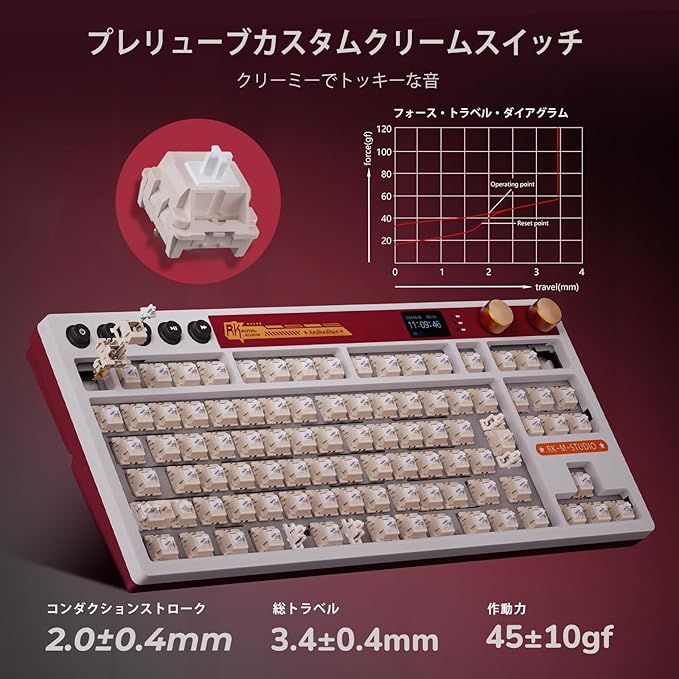 【スマートLCDディスプレイ&直感的デュアルノブ搭載】 LCDスマートディスプレイを内蔵し、時刻・接続状態・バッテリー残量・カスタムGIF画像などをリアルタイムで表示。メカニカルキーボードの状態を一目で確認でき、直感的なカスタマイズも可能です。デュアルノブは音量や各種設定を直感的に操作できるため、ワイヤレスメカニカルキーボードでも快適に日本語配列のTKLキーボードを楽しめます。