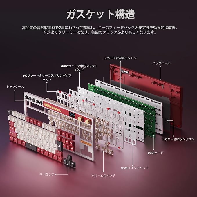 【75%テンキーレス(TKL)&ガスケットマウント構造】93キーの日本語配列TKLデザインでデスクスペースを有効活用。ガスケットマウント構造&吸音層で静かで心地よい打鍵音を実現したゲーミングキーボードです。ワイヤレスメカニカルキーボードながら高級感ある操作性と耐久性を備えています。