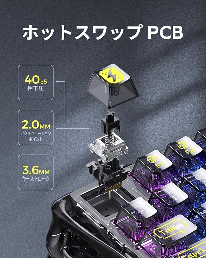 特徴 2.4GHz・Bluetooth 5.0・USB有線接続, ガスケットマウント構造, バックライト付き, ホットスワップ可能, 透明キーキャップ