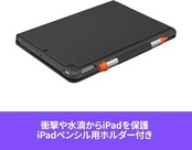 iK1055BKはiPad最新モデル(第9世代)に対応したキーボード一体型ケース。※(iPad 第8世代、第7世代も使用可能)。スリムなシルエットが特徴のこのモデルはタイピング、観覧、キーボード保護に最適なデザインです。 ゆったりとした間隔のキーはノートパソコンのようなキーストロークを可能にし、タイピングモードでは作業に適した58゜の角度でiPadを支え快適なタイピングを実現。 耐水性にも優れており、お手入れも簡単です。折り畳めば表示モードでの使用も可能。お気に入りの動画鑑賞に最適な10 の角度でiPadを支えます。 信頼性の高い低消費電力ブルートゥース通信を採用。Logicool Crayonのホルダー付き。