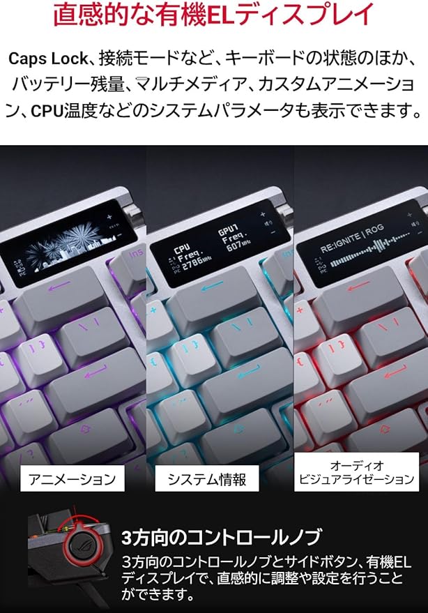 有機ELディスプレイと直感的なコントロール:システム情報やキーボードの設定を一目で確認でき、3方向のノブで手軽に設定を変更