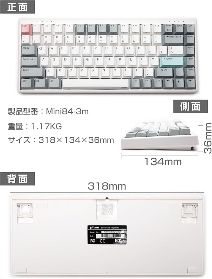 「コンパクトサイズ」キーボードのサイズは長さ31.7 幅13.3 高3.7cmです。持ち運びにも便利です。通常のフルサイズキーボートを圧縮したようなレイアウトなので、違和感なくすぐに慣れることができます。ESC、Enterの各キーは淡いピンクと青緑色で、キーボードのアクセントカラーになっています。灰色の替えキーも付属しているのでシンプルなカラーリングにすることもできます。専用のキーマップツールでカスタマイズでき、キースイッチはCherry MX軸なのでキーキャップを手軽に変えられる。PBT2色成形キーキャップでキートップ表面が多少すり減っても印字が消えない。