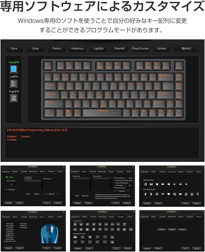 「専用ソフトによるカスタマイズ性が高い」専用ソフトによるキーマッピング変更設定で、キー配置の変更、Combo機能、マクロ機能などをカスタマイズ可能です。またFnキーの組み合わせによるショートカットを駆使すれば、APC機能、Windows/Macの配列を切替、キーをロックなど多様な操作に素早くアクセスできます。※キーマップ変更ツールはWindowsのみ使用可能です(設定保存後はMac使用時にも反映されます)。専用のキーマップツールでカスタマイズでき、キースイッチはCherry MX軸なのでキーキャップを手軽に変えられる。PBT2色成形キーキャップでキートップ表面が多少すり減っても印字が消えない。