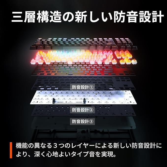 【三層構造の新しい防音設計】機能の異なる3つのレイヤーによる新しい防音設計により、余分なタイピング音を軽減。スイッチ基盤の上に配置された1層目は振動と金属音を軽減し、スイッチ基盤下部にある2層目が柔らかいキータッチとともに満足のいく深いタイプ音を実現しました。更に最下部に設置された密度の高いシリコン素材の3層目は、キーボードの空間を埋め音を吸収することで心地よく深いタイプ音です。