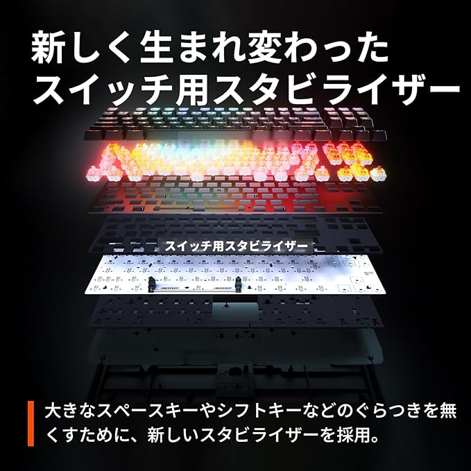 【新しく生まれ変わったスイッチ用スタビライザー】キーの安定性を向上する新しいスタビライザーを採用し、主にスペースキーやシフトキーなどの大きなキーのぐらつきを劇的に改善しました。また、スタビライザーの潤滑剤処理を見直すことで、キー全体のタイピング音が向上しています。