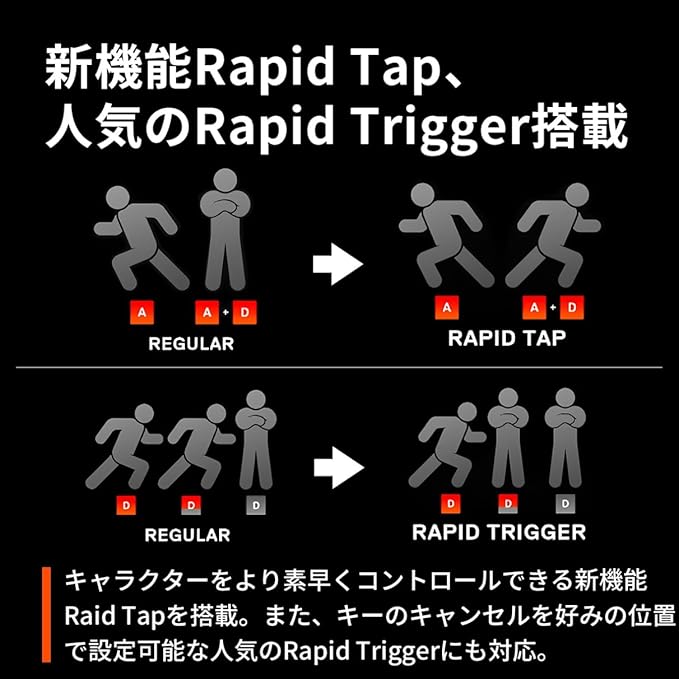 【新機能Rapid Tap、人気のRapido Trigger搭載】:キャラクターをより素早くコントロールできる新機能Raid Tapを搭載。また、キーのキャンセルを好みの位置でキー毎に設定可能な人気のRapid Triggerにも対応しています。