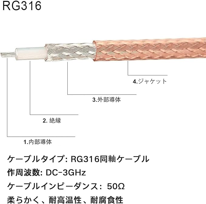 【細くて便利なRG316同軸ケーブル延長ケーブル】:ケーブルの直径は約2.5mm、狭いスペースでの配線に便利です