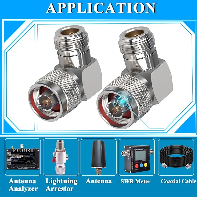 タイプと詳細: N オス対メス 90 度同軸コネクタ; 色: 金と銀; 材質: 真鍮とニッケルメッキ; インピーダンス: 50 オーム、低損失