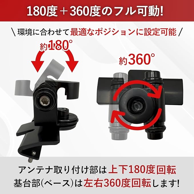 ✅【360度+180度のフル可動!角度調整も自由自在】 アンテナ取り付け部は上下180度、基台部は左右360度回転。自由な角度調整が可能で、通信環境に合わせて最適なポジションに設定できます。※アンテナや同軸ケーブルの干渉により可動範囲は制限される場合があります。