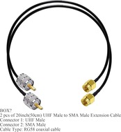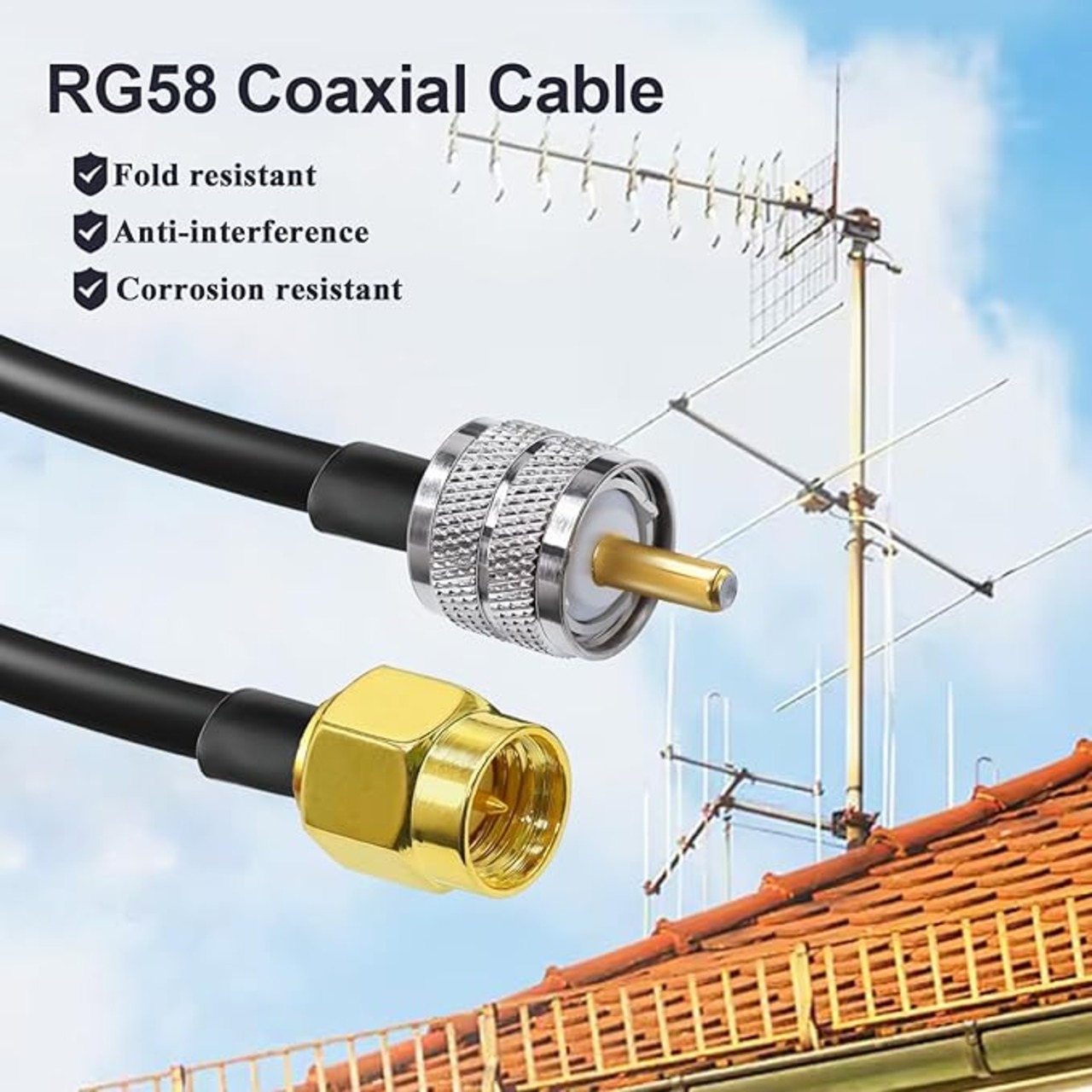 【ケーブルの種類と詳細】SMAオス-UHFオス同軸ケーブル。ケーブルタイプ:RG58;導体材質:純銅;ケーブル長:20インチ(50cm);インピーダンス:50オーム、低損失