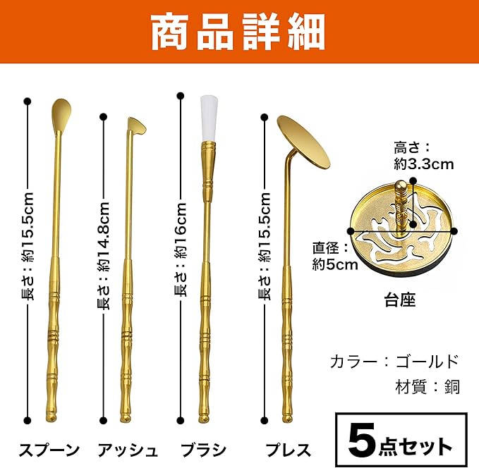 セット内容:5点セット(台座、スプーン、アッシュ、プレス、ブラシ) カラー:ゴールド 材質:銅 サイズ:台座高さ約3.3 直径約5cm、スプーン:長さ約15.5cm、アッシュ:長さ約14.8cm、ブラシ:長さ約16cm、プレス:長さ約15.5cm ※モニターの環境等により色の見え方に若干差が生じる場合がございます。